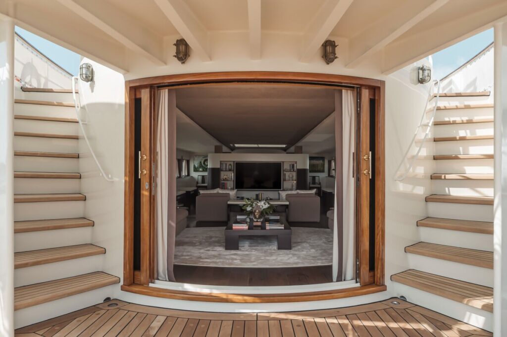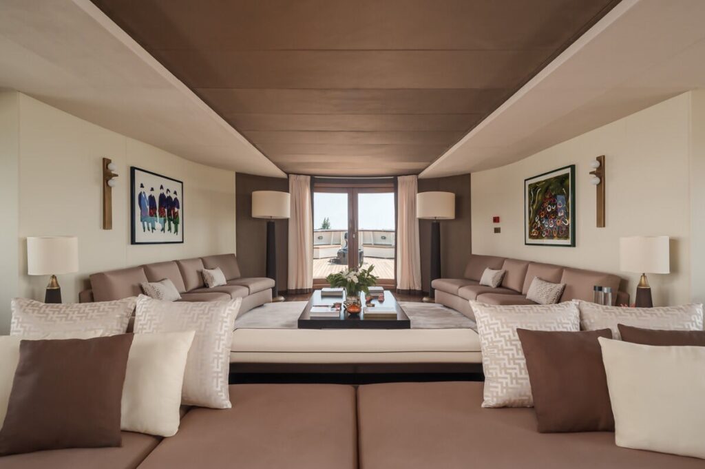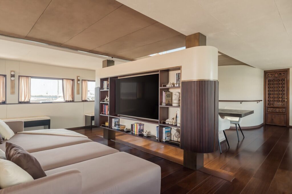 Her interiors, designed by Water Line, feature warm beige and cream tones that create a serene, elegant ambiance. The main saloon’s dual sofa arrangement and entertainment wall provide a perfect balance of comfort and style, while her seven-stateroom layout accommodates up to 12 guests in refined luxury. The full-beam master suite includes a private walk-in closet, and up to nine crew are housed in well-designed quarters.