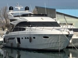 Her interiors, designed by Water Line, feature warm beige and cream tones that create a serene, elegant ambiance. The main saloon’s dual sofa arrangement and entertainment wall provide a perfect balance of comfort and style, while her seven-stateroom layout accommodates up to 12 guests in refined luxury. The full-beam master suite includes a private walk-in closet, and up to nine crew are housed in well-designed quarters.