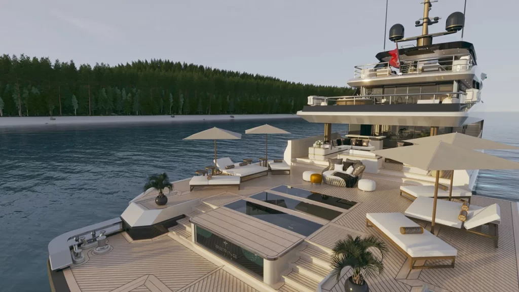 The Bering 165 is the largest model in the shipyard’s portfolio, offering 499GT across five decks and a layout designed to feel significantly larger than her length. Exterior styling was developed in collaboration with Valentin Design, with the general arrangement by Aberton Yachts and engineering by Eureka Yachts.