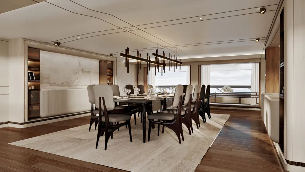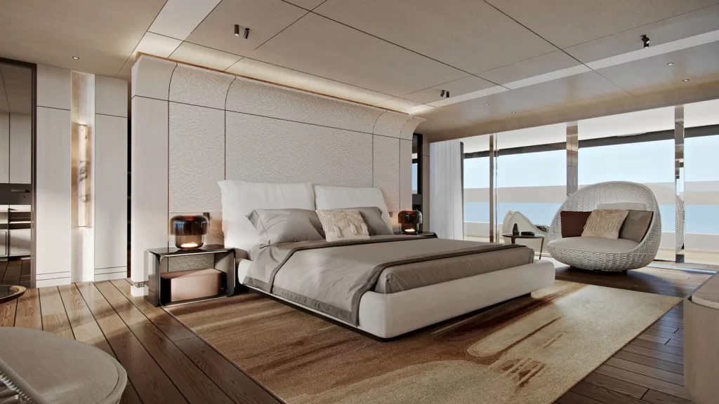 “The search for new experiences and horizons is emphasised by the desire to offer an oasis of comfort that is perfect in any setting,” said Alessandro Pulina, founder and CEO of Pulina Exclusive Interiors. He described the interior as gentle and dreamlike, featuring neutral tones, natural materials like linen and cashmere, and subtle contrasts that evoke calm and sophistication.