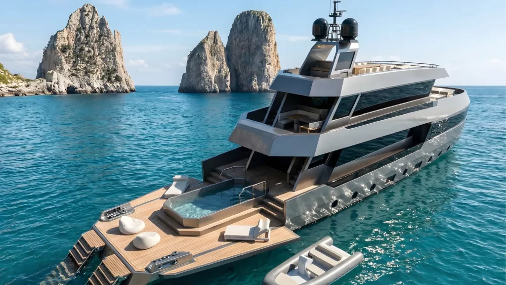 One of the concept’s standout features is its innovative toy storage and deployment system, developed to maximise onboard space while maintaining clean, uninterrupted exterior lines. The tender is housed aft within a multifunctional beach club compartment. When closed, the hatch forms a flush deck area furnished with sun loungers; during deployment, it slides beneath the main deck floor. Once the tender is launched, the compartment can be filled with water and transformed into a swimming pool, while fold-down side platforms open the space into a generous sea terrace. Additional storage includes a dedicated bow jet-ski locker, which converts into a sunbathing area when closed, as well as a hidden crane for easy water-toy handling.