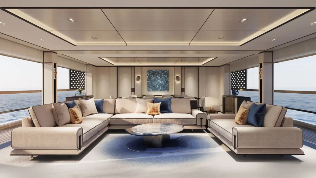 Among the most striking features of the Panorama model is its wellness-inspired beach club, equipped with a glass-sided pool and folding sea terraces that extend the social area over the water. Interiors follow a warm palette with natural woods, soft tones, and materials selected to create an inviting, serene atmosphere.