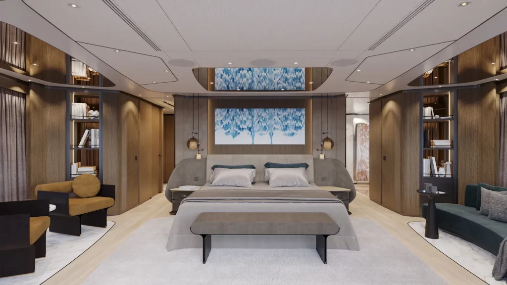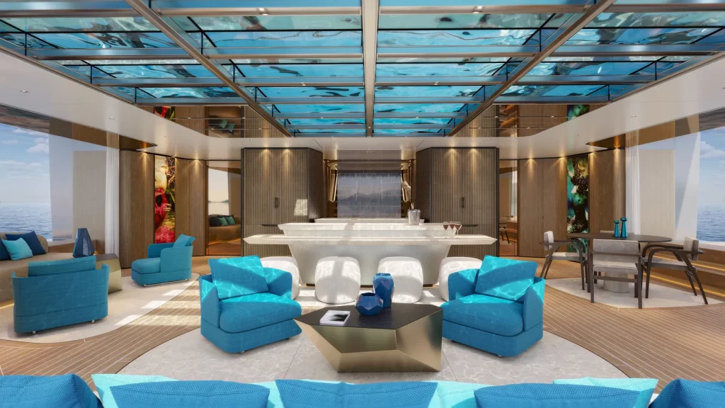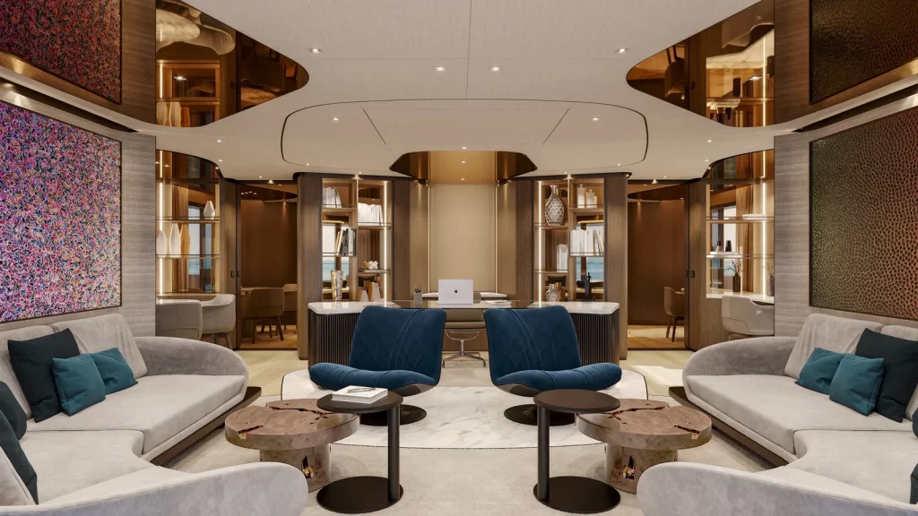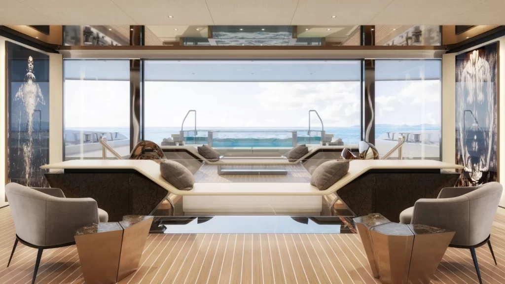 Among her standout features is an expansive wellness area spanning the yacht’s 13.1-metre beam. It includes a massage room, Hammam plunge pool, sauna, and a family lounge for younger guests. The owner’s deck offers total privacy, with a hot tub, lounge, office, and two spa-inspired bathrooms.