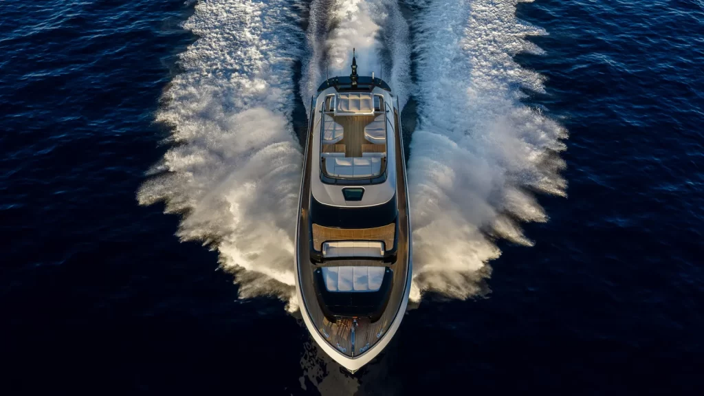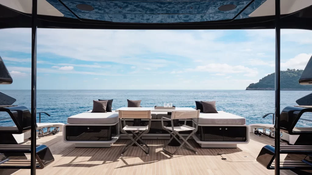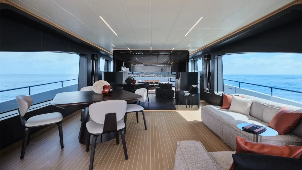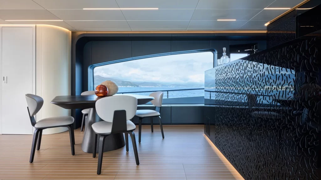 The interiors are minimalist yet inviting, with teak parquet floors, Italian leather, integrated LED lighting, and light-toned ceilings. A standout innovation is the black-lacquered galley seamlessly integrated into the saloon, doubling as a cocktail bar. This design choice frees up space on the lower deck to accommodate an additional guest cabin.
