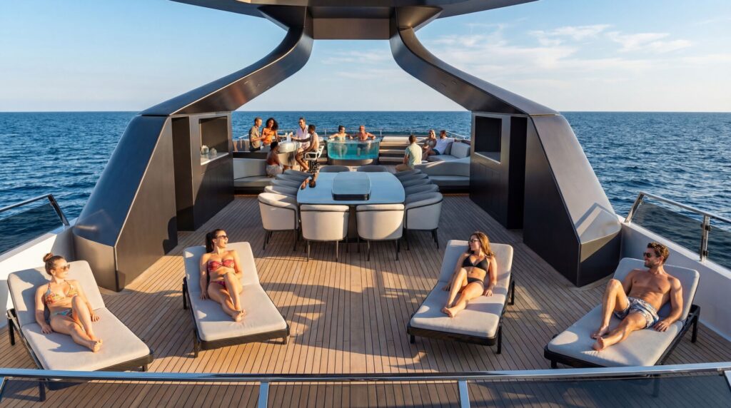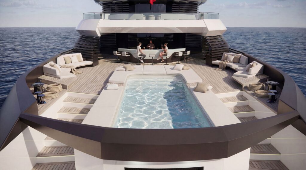 At the stern, Up.Stars delivers a powerful connection to the sea. This social and experiential hub is anchored by a large swimming pool and a cascading waterfall that visually draws guests toward the ocean. Designed as the yacht’s primary lifestyle platform, the open stern offers an inviting space for relaxation, socialising and immersive sea-level experiences.