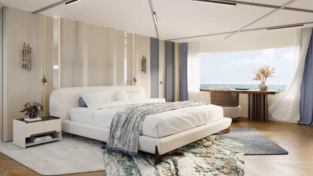 The yachts feature beams ranging from seven to eight metres, depending on owner preference, paired with minimum ceiling heights of two metres throughout. This configuration results in an interior volume of approximately 250–270GT, delivered through an open-plan layout optimised for extended stays onboard.