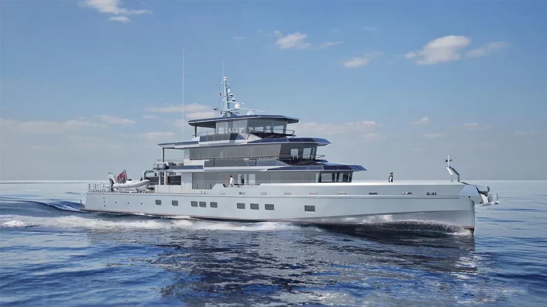 A hybrid propulsion system, supported by solar panels and high-capacity batteries, enables silent, emission-free operation at anchor and in port. The yacht reaches 20 knots in hybrid boost mode and offers a range of over 5,000 nautical miles at 12 knots.