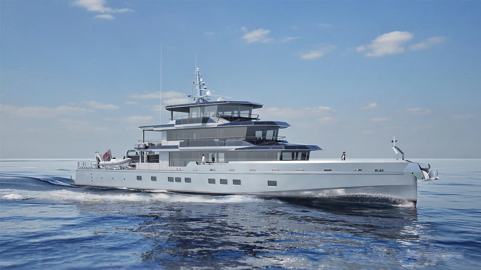 The aluminium yacht, with a composite upper superstructure, features naval architecture and exterior design by Humphreys Yacht Design, delivering reduced weight, a lower centre of gravity and improved efficiency. Built to an owner’s brief prioritising comfort, safety and exploration, the yacht offers exceptional tender and toy capacity supported by three dedicated cranes, including a C-davit for a 9.25-metre tender.