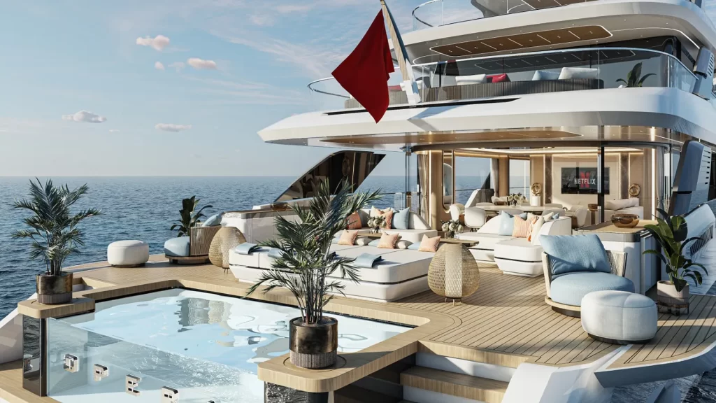 A key feature is the glass-fronted dip pool on the aft deck. Sunpads and a generous lounge area surround the pool, while fold-down bulwarks open the space directly to the sea. Curved glass panels slide away to create an open-air dining area, blending interior comfort with an al fresco setting.