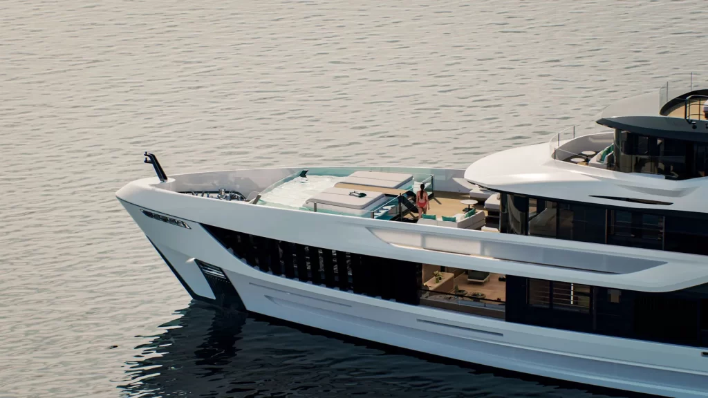 Other highlights include a main deck lounge-patio (to be fitted as a fitness area on this unit) and a flexible interior layout. The first hull will feature two VIP cabins on the main deck—one converted into a private office—and four guest cabins on the lower deck, accommodating up to 12 guests.