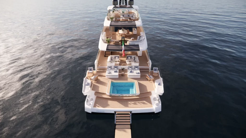 Accommodation includes a 50-square-metre owner’s suite with private office, spa-inspired bathroom, and a slide-out terrace, alongside four VIP guest cabins on the lower deck and quarters for eight crew. Interiors reflect Nuvolari Lenard’s refined Mediterranean aesthetic, combining warm tones, premium woods, and expansive glazing.