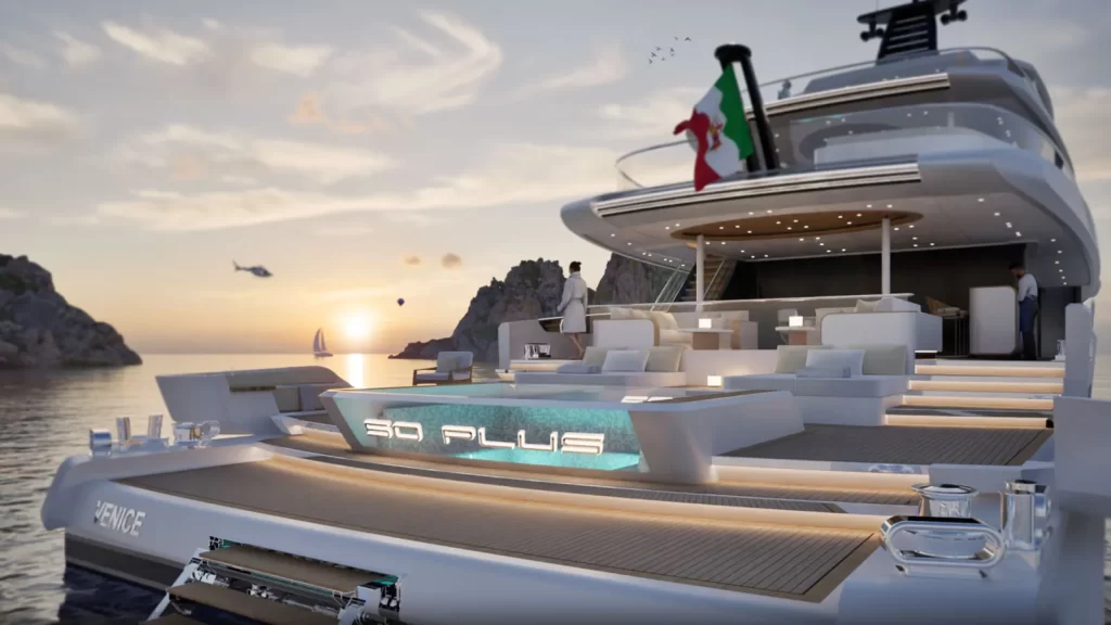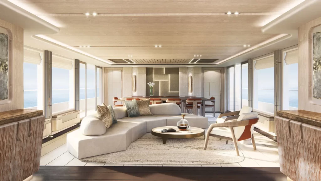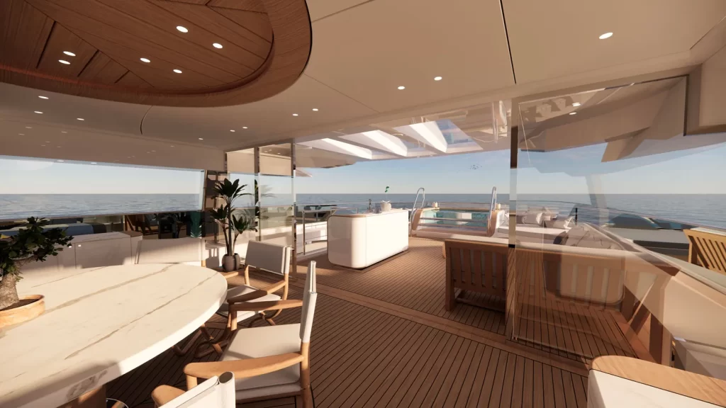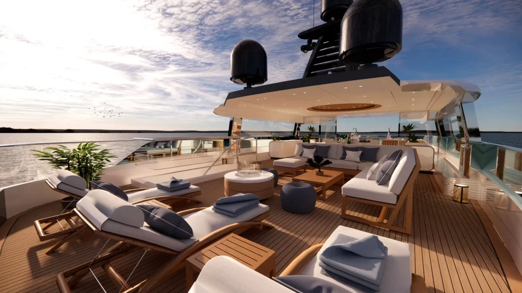 Outdoor lifestyle spaces continue forward, with a generous foredeck that doubles as an open-air cinema and a sundeck described as one of the largest in its category, complete with a heated spa pool and fire pit.