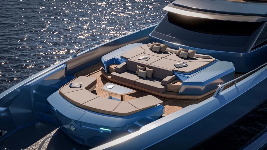 The stern includes open bulwarks to improve line handling during docking. Automotive-inspired elements appear along the sides, with structures that extend beyond the beam.