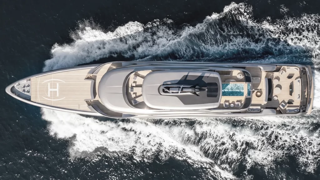 One of the yacht’s standout features is the “people pad”—an overwater terrace positioned above the main deck aft, functioning as an open-air lounge. Designed almost like a secondary sundeck closer to the water, it includes a double-sided bar serving both indoor and outdoor spaces.